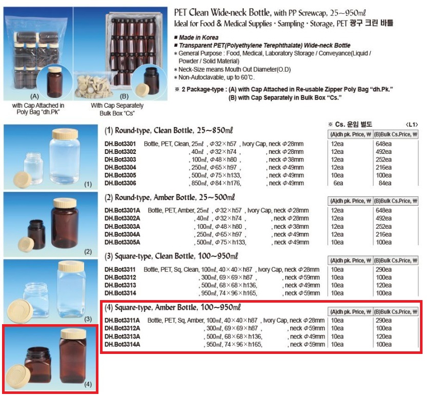 DAIHAN® PET Clean Wide-neck Bottle, with PP Screwcap, 25~950㎖Ideal for Food & Medical Supplies·Sampling·Storage, PET 광구 크린 바틀