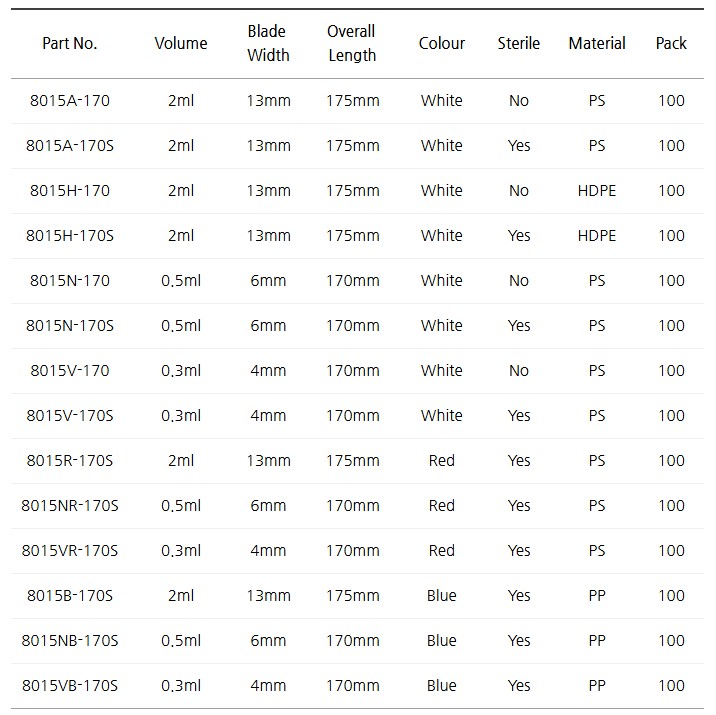 - 좁은 블레이드는 바이알 같은 매우 작은 용기에서도 채취를 가능하게 함