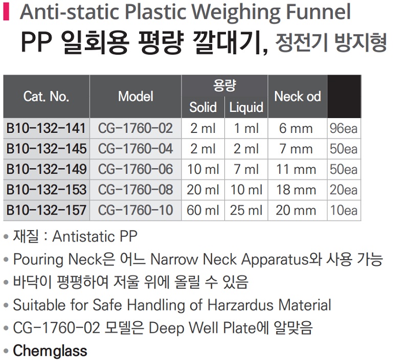 품명 ■ 재질 : Antistatic PP ■ Pouring Neck은 어느 Narrow Neck Apparatus 와 사용 가능 ■ 바닥이 평평하여 저울 위에 올릴 수 있음 ■ Suitable for Safe Handling of Harzardus Material ■ CG-1760-02 모델은 Deep Well Plate에 알맞음 ■ Chemglass