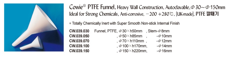 Cowie® PTFE Funnel, Heavy Wall Construction, Autoclavable,Φ30~Φ150mmIdeal for Strong Chemicals, Anti-corrosive, -200 +280℃, [ UK-made ] , PTFE 깔때기