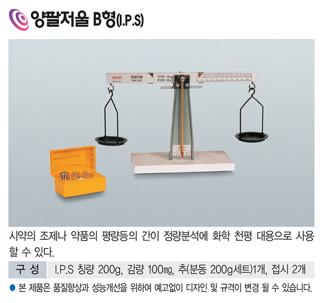 품명 시약·조제·약품 등의 평량과 정량분석에 사용되는 양팔저울로, I.P.S 칭량추 세트와 접시가 포함된 교육용 저울이며 화학 실험과 정밀 측정에 적합한 제품입니다.