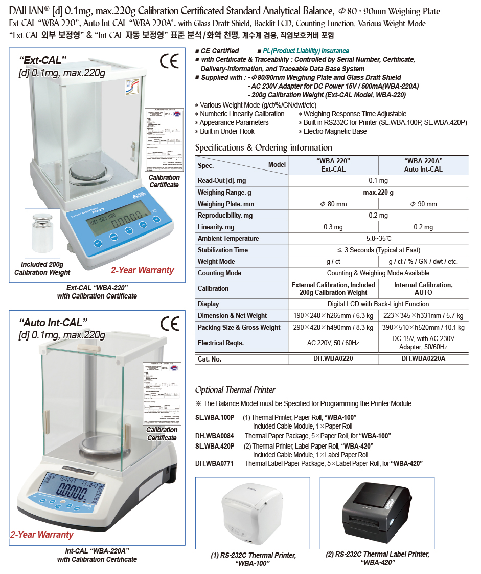 [d] 0.1mg, max.220g Calibration Certificated Standard Analytical Balance, Φ80 · 90mm Weighing PlateExt-CAL “WBA-220”, Auto Int-CAL “WBA-220A”, with Glass Draft Shield, Backlit LCD, Counting Function, Various Weight Mode“Ext-CAL 외부 보정형 ” & “Int-CAL 자동 보정형 ”