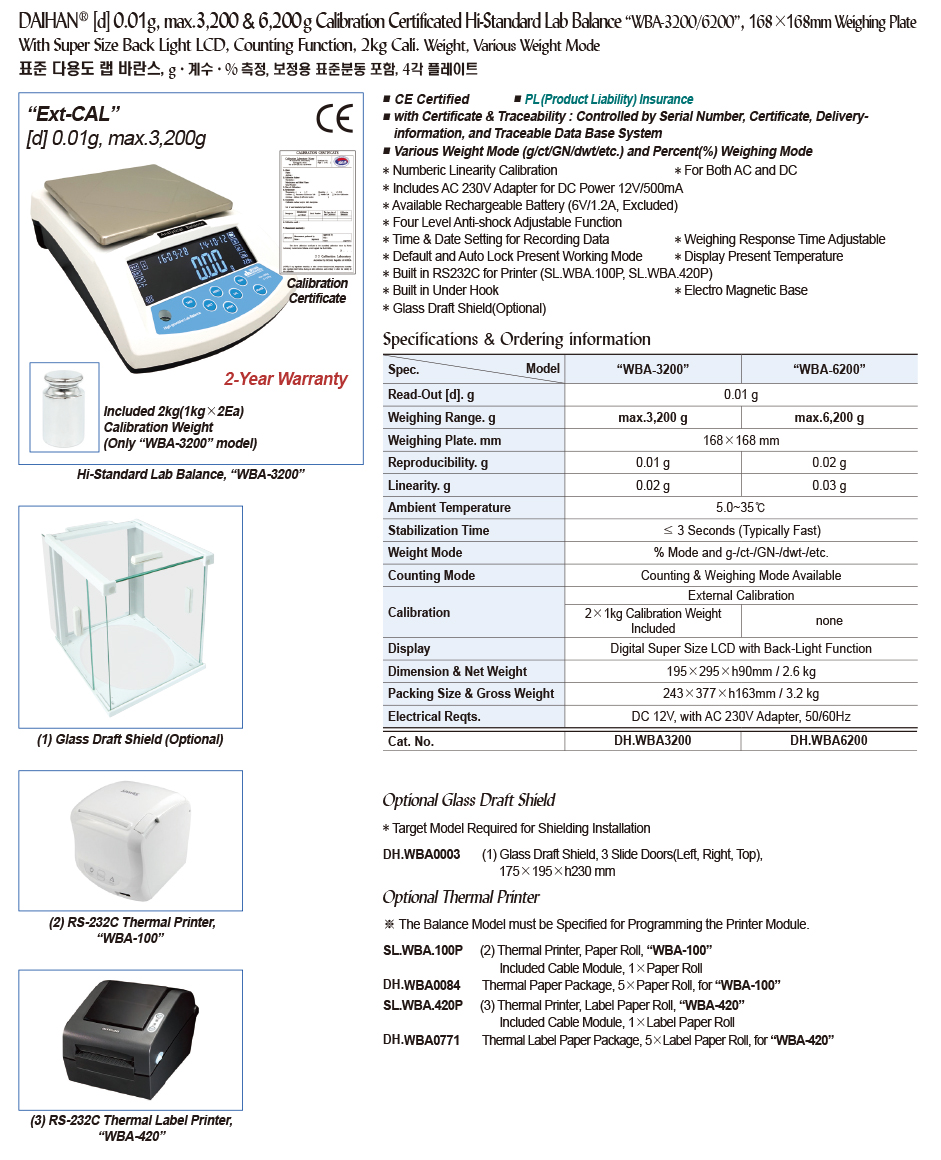 0.01g, max.3,200g/6,200g Hi-Standard Lab Balance “WBA-3200/6200” , 168×168mm Weighing PlateWith Super Size Back Light LCD, Counting Function, Ext-CAL, 2kg Cali. Weight, Various Weight Mode, with Certi. & Traceability표준 다용도 랩 바란스, g· 계수 ·% 측정, Ext-CAL ( 표준분동 포함 ), 4 각 플레이트