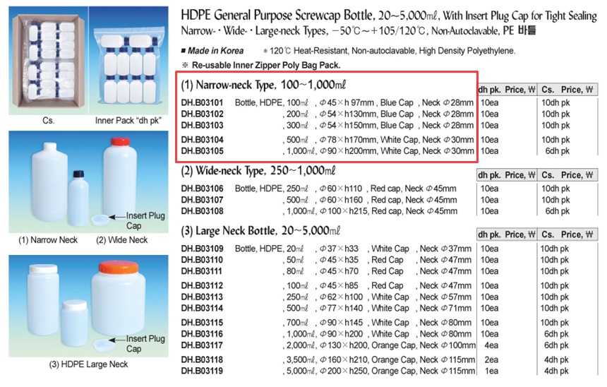 HDPE General Purpose Screwcap Bottle, 20~5,000㎖, With Insert Plug Cap for Tight SealingNarrow- · Wide- · Large-neck Types, -50℃~+105/120℃, Non-Autoclavable, PE 바틀