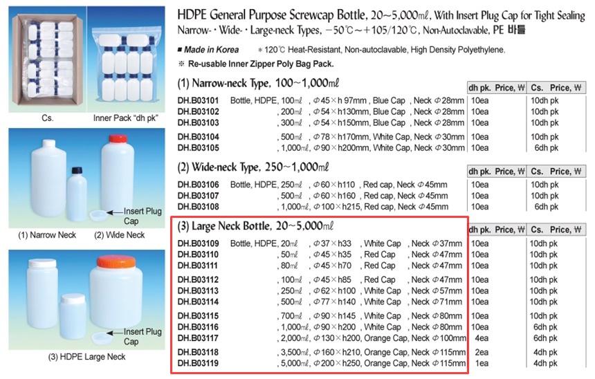 HDPE General Purpose Screwcap Bottle, 20~5,000㎖, With Insert Plug Cap for Tight SealingNarrow- · Wide- · Large-neck Types, -50℃~+105/120℃, Non-Autoclavable, PE 바틀