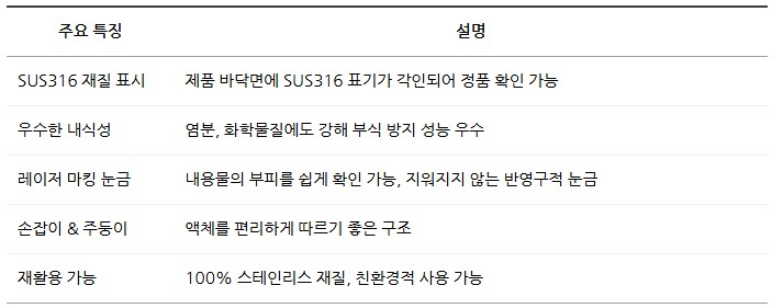 내식성과 내열성이 뛰어나 장시간 사용에도 변형이나 부식이 적으며, 재활용 가능한 친환경 소재로 제작되었습니다.