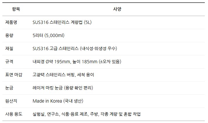 품명 녹슬지 않는 SUS316 스테인리스 계량컵 5L, 실험실·식품·연구소에서 위생적으로 사용하는 대용량 계량컵.