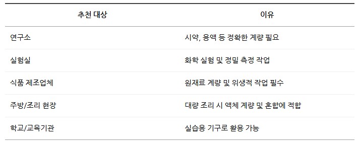 실험실, 연구소, 식품 가공 현장 등에서 널리 사용되며, 손잡이와 주둥이가 있어 액체를 편리하게 따를 수 있습니다.