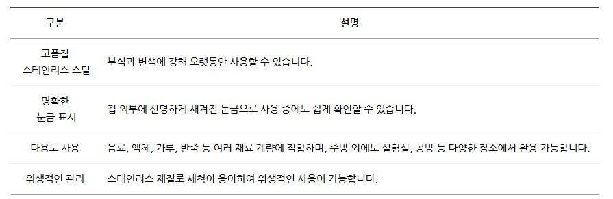위생적인 스테인리스 재질로 세척이 용이하며, 다용도로 사용하기 좋은 실속형 계량 도구입니다.