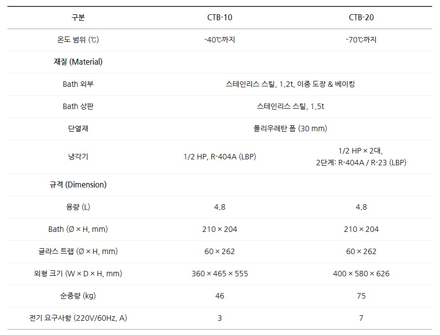 CTB-10 모델은 최저 -40℃, CTB-20 모델은 최저 -70℃까지 냉각이 가능하여 다양한 실험 및 연구 환경에서 활용할 수 있습니다.