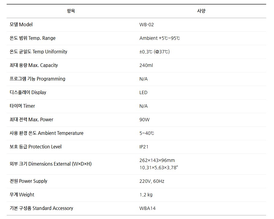 품명 WB-02 미니 워터배스는 ±0.3°C 온도 균일도, LED 디스플레이, 자동 과열 방지 기능으로 정확한 시약 가열과 튜브 보온에 최적화된 항온수조입니다.
