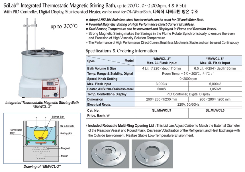 SciLab® Integrated Thermostatic Magnetic Stirring Bath, up to 200℃, 0~2,000rpm, 4 & 6.5LitWith PID Controller, Digital Display, Stainless-steel Heater, can be used for Oil-/Water-Bath, 다목적 자력교반 항온 수조