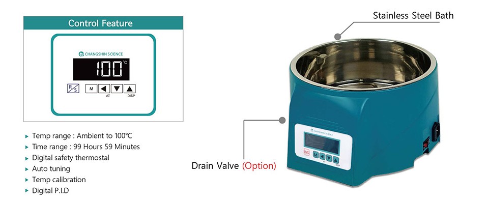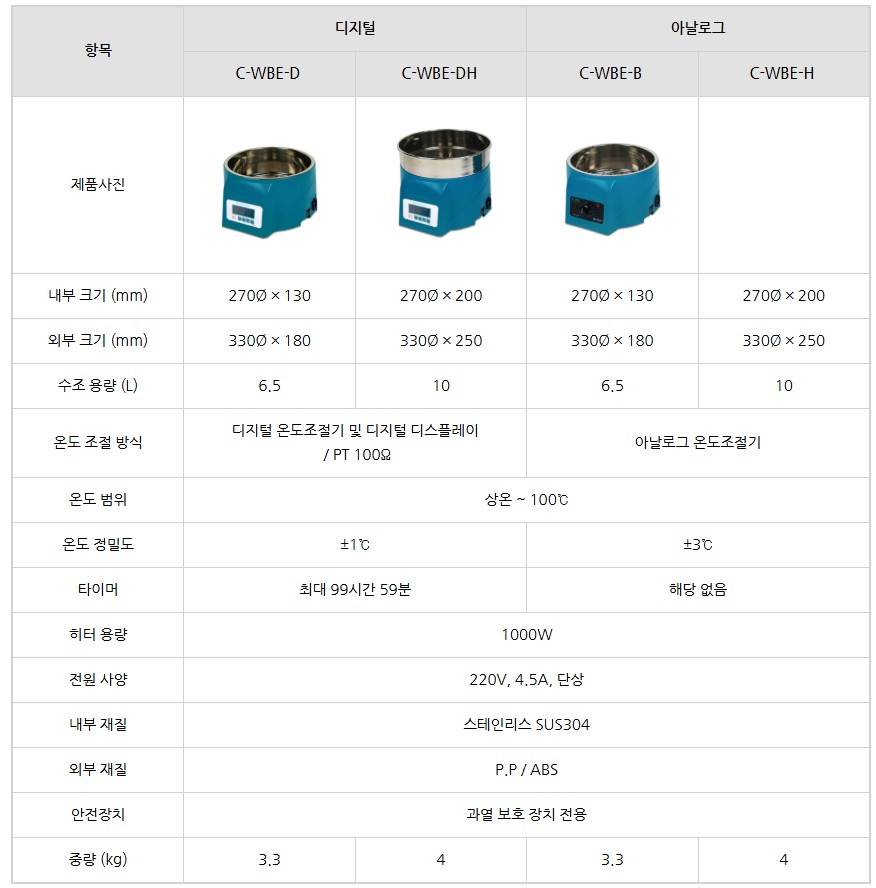 디지털 온도 조절기(PID) 또는 아날로그 조절기 선택이 가능하며, 수조 크기와 기능에 따라 4가지 모델이 있습니다.