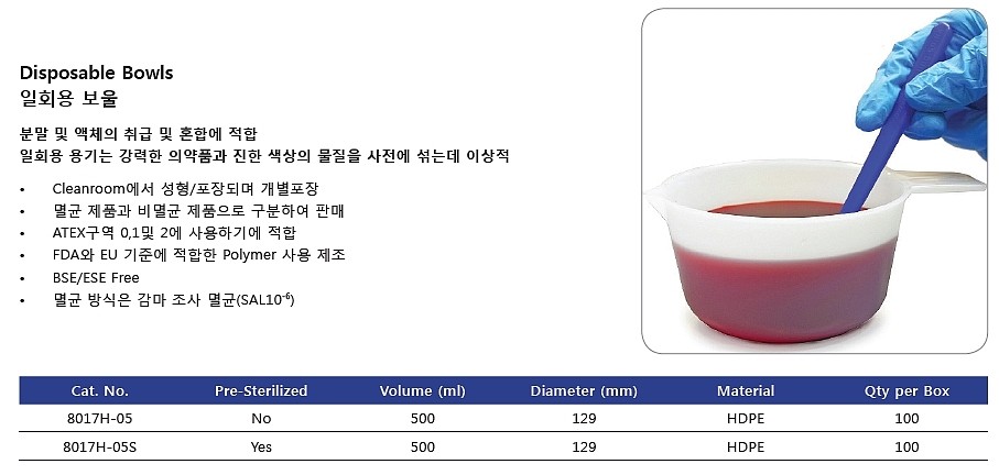 품명 분말 및 액체의 취급 및 혼합에 적합 일회용 용기는 강력한 의약품과 진한 색상의 물질을 사전에 섞는데 이상적