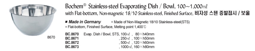 Bochem® Stainless-steel Evaporating Dish / Bowl, 100~1,000㎖ with Flat-bottom, Non-magnetic 18/10 Stainless-steel, Finished Surface, 비자성 스텐 증발접시 / 보울