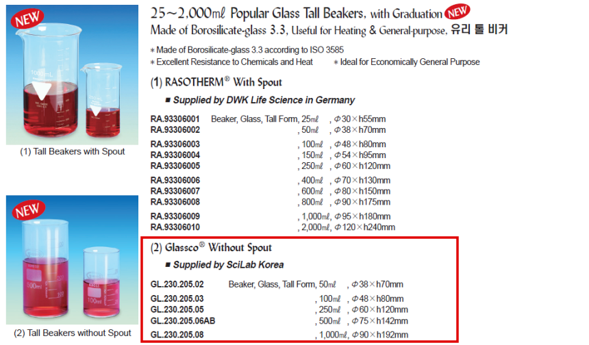 25~2,000㎖ Popular Glass Tall Beakers, with Graduation Made of Borosilicate-glass 3.3, Useful for Heating & General-purpose, 유리 톨 비커