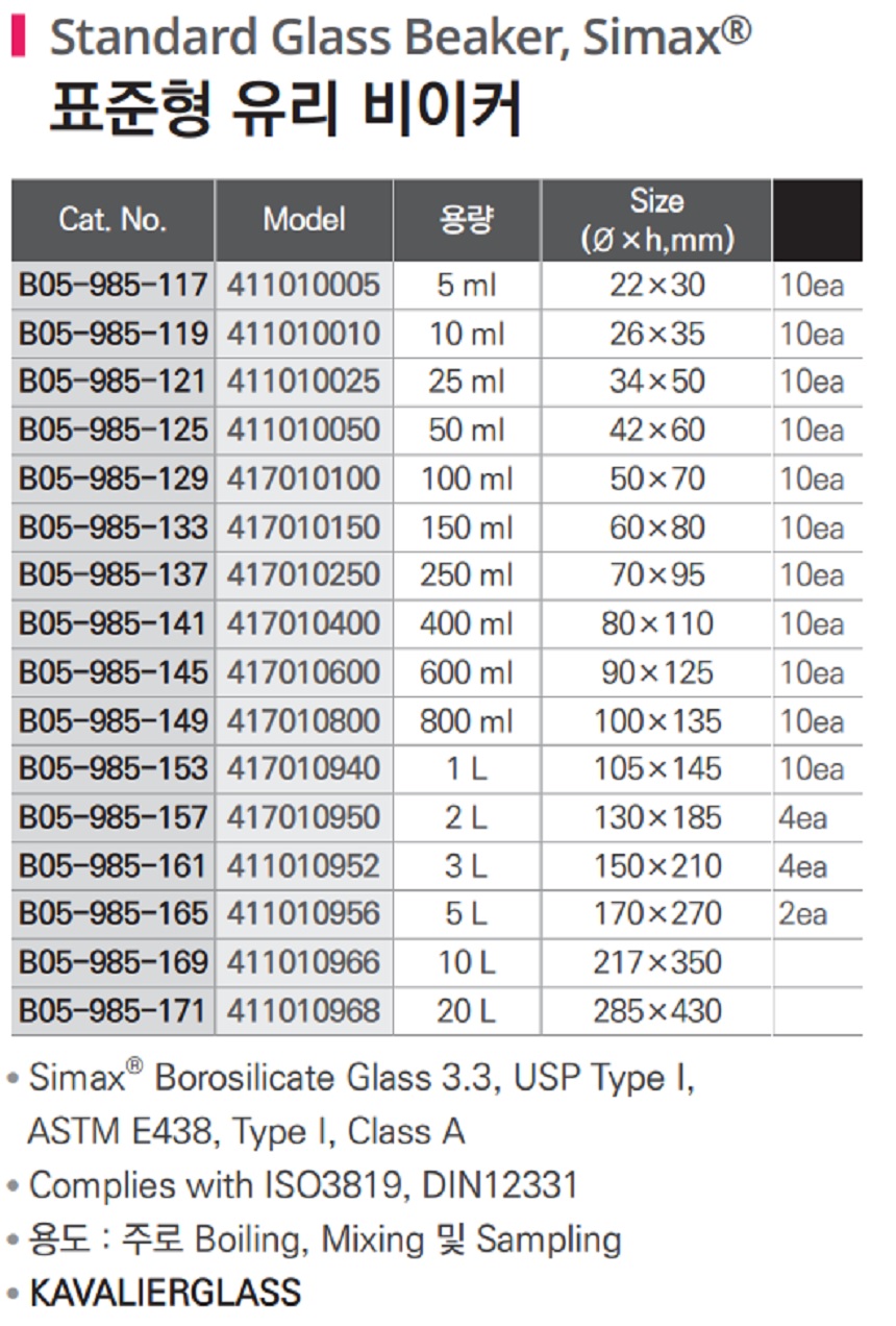 표준형 유리 비이커 Standard Glass Beaker, Simax® 유리 비커, B05-985-117
