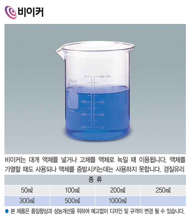 개요 : 비이커는 대개 액체를 넣거나 고체를 액체로 녹일 때 이용됩니다. 액체를 가열할 때도 사용되나 액체를 증발시키는데는 사용하지 못합니다.