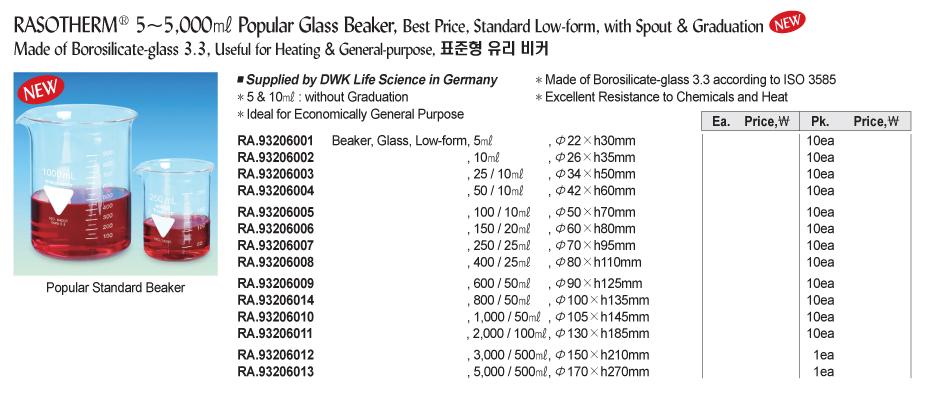 RASOTHERM® 5~5,000㎖ Popular Standard Glass Beakers, Low-form, with Spout & Graduation Made of Borosilicate-glass 3.3, Useful for Heating & General-purpose