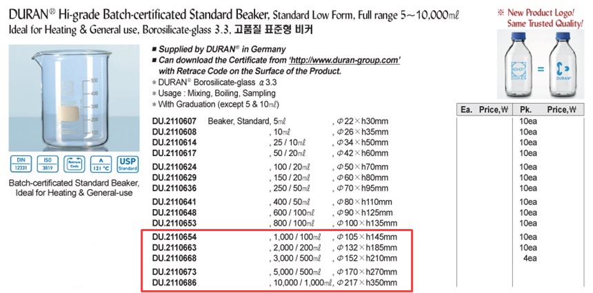 DURAN® Hi-grade Batch-certificated Standard Beaker, Standard Low Form, Full range 5~10,000㎖Ideal for Heating & General use, Borosilicate-glass 3.3 , 고품질 표준형 비커
