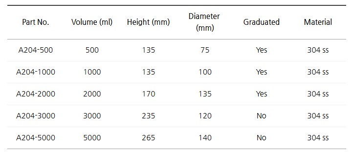 품명 304 스테인리스 재질로 제작된 실험용 저그. 위생적이며 내구성이 뛰어나 액체 계량 및 분배에 적합. 다양한 용량 선택 가능.