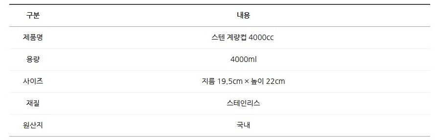 고급 스테인리스 소재로 제작된 4000ml 계량컵은 내구성과 위생성이 뛰어나 오래 사용해도 녹슬지 않고 변색이 되지 않습니다.