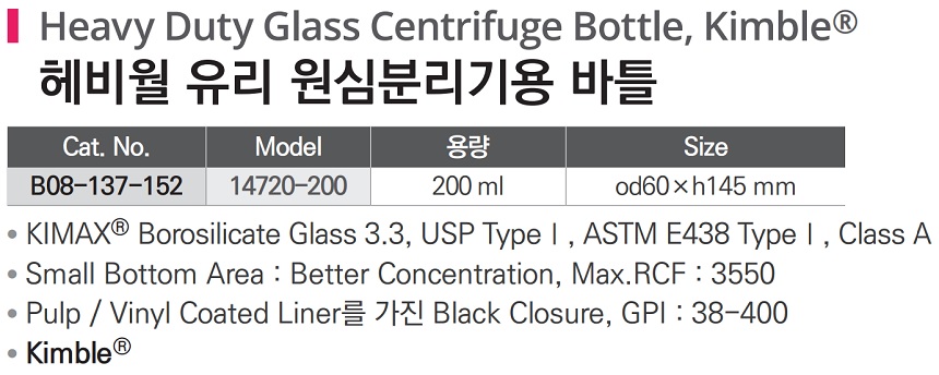 헤비월 유리 원심분리기용 바틀 Heavy Duty Glass Centrifuge Bottle, Kimble®, B08-137-152
