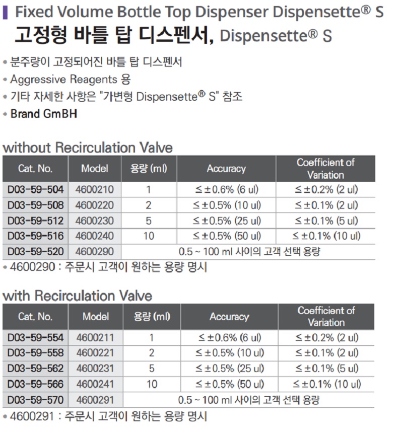 With Recirculation Valve| Cat. No | Model | 용량 (ml) | Accuracy | Coefficient of variation |