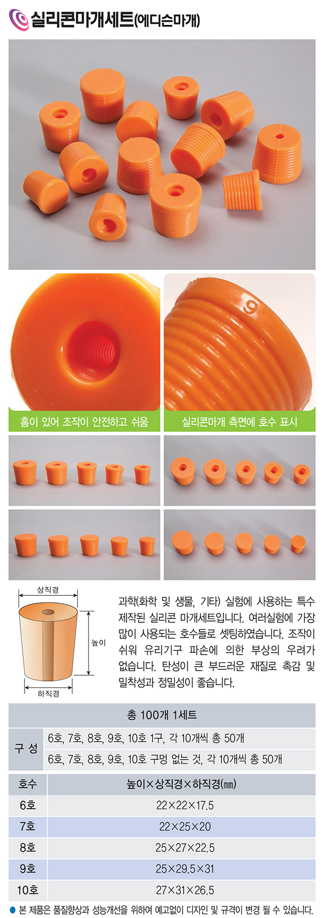 품명 특징 ● 특수제작된 실리콘 마개 ● 가장 많이 사용되는 호수들로 셋팅 ● 탄성이 큰 부드러운 재질로 촉감 및 밀창성 과 정밀성우수
