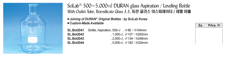 500~5,000㎖ DURAN glass Aspiration / Leveling BottleWith Outlet Tube, Borosilicate Glass 3.3