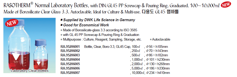 RASOTHERM® Normal Laboratory Bottles, with DIN/GL45 PP Screwcap & Pouring Ring, Graduated, 100~10,000㎖ Made of Borosilicate Clear Glass 3.3, Autoclavable, Ideal for Culture & Multi-use