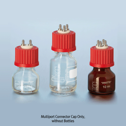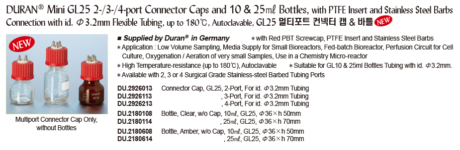 DURAN® Mini GL25 2-/3-/4-port Connector Caps and 10 & 25㎖ Bottles, with PTFE Insert and Stainless Steel Barbs Connection with id. Φ3.2mm Flexible Tubing, up to 180℃, Autoclavable