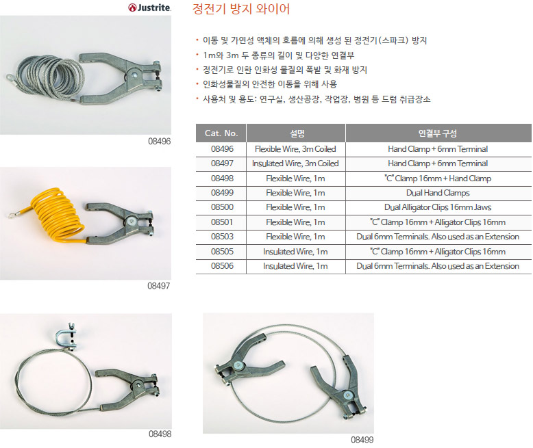 품명 정전기 방지 와이어 ▶ 이동 및 가연성 액체의 흐름에 의해 생성된 정전기(스파크) 방지 ▶ 1m와 3m 두 종류의 길이 및 다양한 연결부 ▶ 정전기로 인한 인화성 물질의 폭발 및 화재 방지 ▶ 인화성물질의 안전한 이동을 위해 사용 ▶ 사용처 및 용도 : 연구실, 생산공장, 작업장, 병원 등 드럼 취급장소