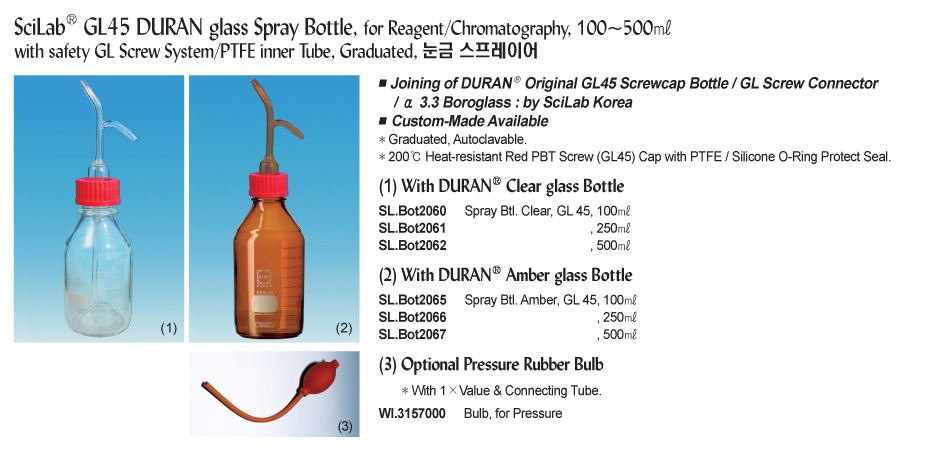 GL45 DURAN glass Spray Bottle, for Reagent/Chromatography, 100~500㎖ with safety GL Screw System/PTFE inner Tube, Graduated