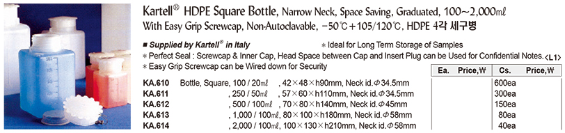 Kartell® HDPE Square Bottle, Narrow Neck, Space Saving, Graduated, 100~2,000㎖With Easy Grip Screwcap, Non-Autoclavable, -50℃~+105/120℃, HDPE 4 각 세구병
