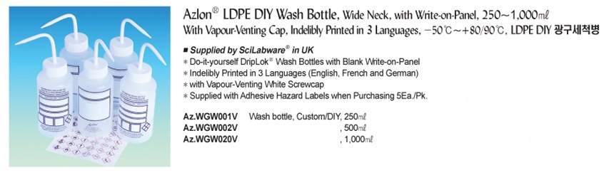 Azlon® LDPE DIY Wash Bottle, Wide Neck, with Write-on-Panel, 250~1,000㎖With Vapour-Venting Cap, Indelibly Printed in 3 Languages, -50℃~+80/90℃, LDPE DIY 광구세척병