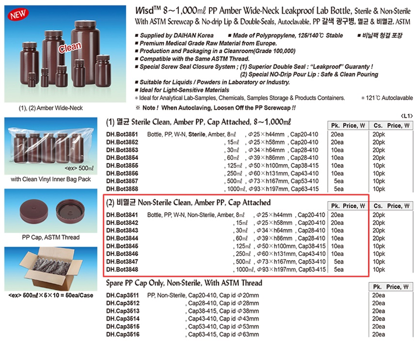 Wisd 8~1,000㎖ PP Amber Wide-Neck Leakproof Lab Bottle, Sterile & Non-Sterile With ASTM Screwcap & No-drip Lip & Double-Seals, Autoclavable, PP 갈색 광구병, 멸균 & 비멸균, ASTM