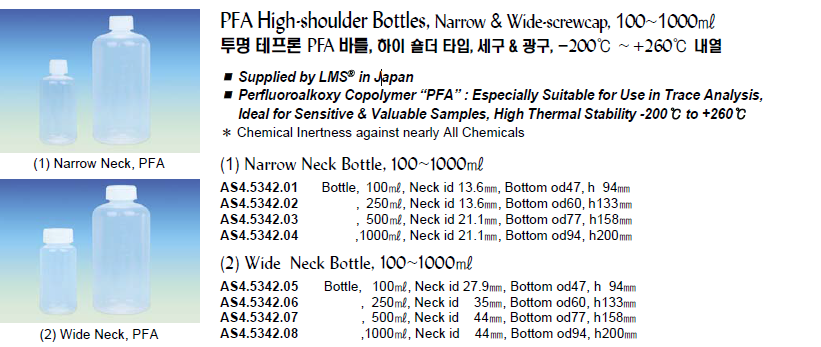 PFA High-shoulder Bottles, Narrow &Wide-screwcap, 100~1000㎖