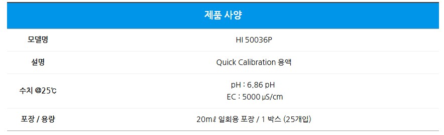 품명 HI 50036P Quick Calibration 용액은 pH 6.86과 EC 5000μS/cm으로 보정 가능한 표준 교정용액으로, 20mL 일회용 포장 25개입 구성의 실험실용 보정 솔루션입니다.