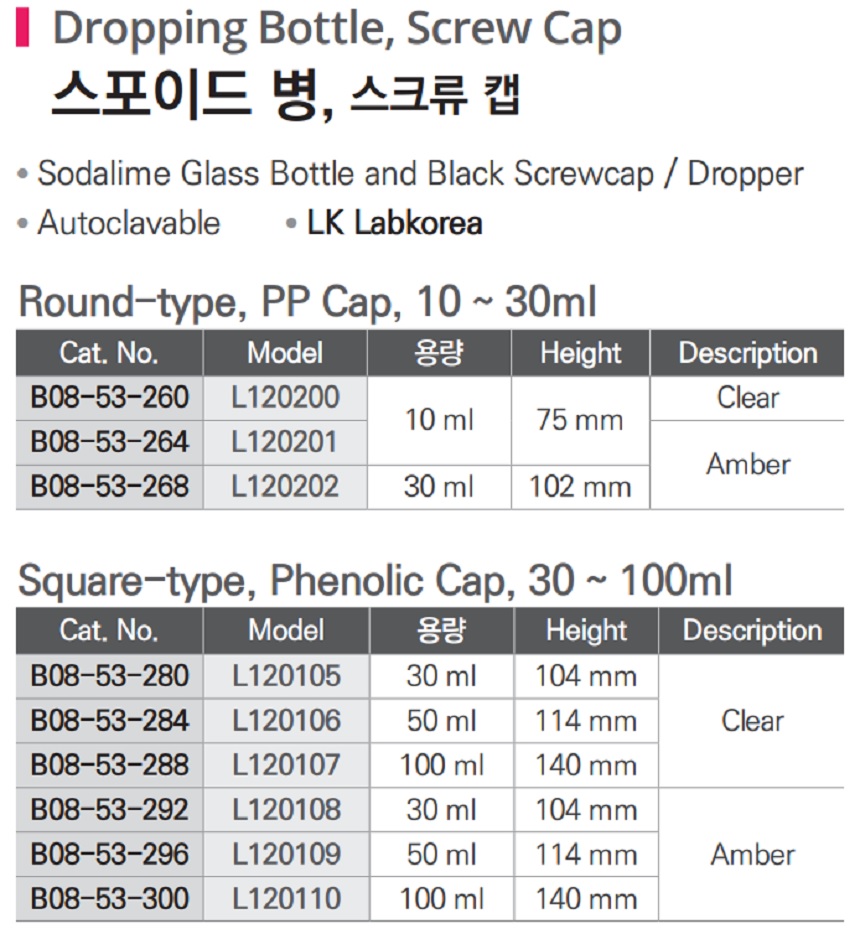 품명 ■ Sodalime Glass Bottle and Black Screwcap / Dropper ■ Autoclavable