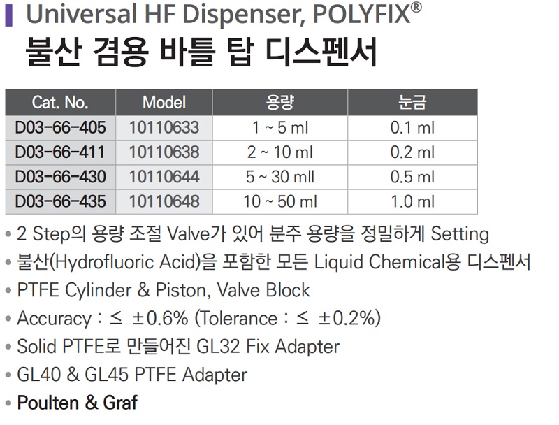 품명 ■ 2 Step의 용량 조절 Valve가 있어 분주 용량을 정밀하게 Setting ■ 불산(Hydrofluoric Acid)을 포함한 모든 Liquid Chemical용 디스펜서 ■ PTFE Cylinder & Piston, Valve Block ■ Accuracy : ≤ ±0.6% (Tolerance : ≤ ±0.2%) ■ Solid PTFE로 만들어진 GL32 Fix Adapter ■ GL40 & GL45 PTFE Adapter ■ Poulten &