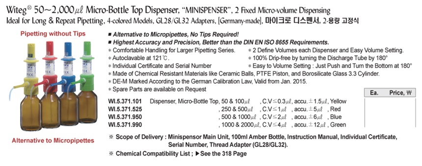 Witeg® 50~2,000㎕ Micro-Bottle Top Dispenser, “MINISPENSER”, 2 Fixed Micro-volume DispensingIdeal for Long & Repeat Pipetting, 4-colored Models, GL28/GL32 Adapters, [ Germany-made ] , 마이크로 디스펜서, 2- 용량 고정식