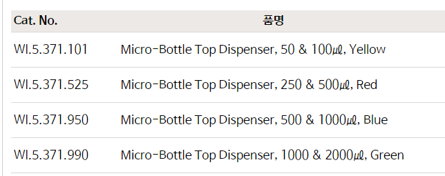 품명 마이크로 디스펜서, 2- 용량 고정식 50ul - 2,000ul