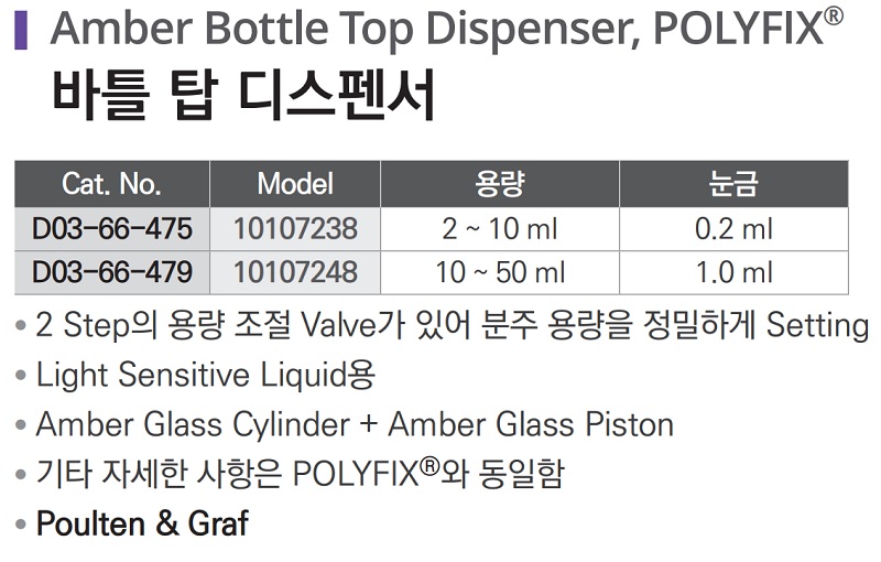 품명 ■ 2 Step의 용량 조절 Valve가 있어 분주 용량을 정밀하게 Setting ■ Light Sensitive Liquid용 ■ Amber Glass Cylinder + Amber Glass Piston ■ 기타 자세한 사항은 POLYFIX®와 동일함 ■ Poulten & Graf