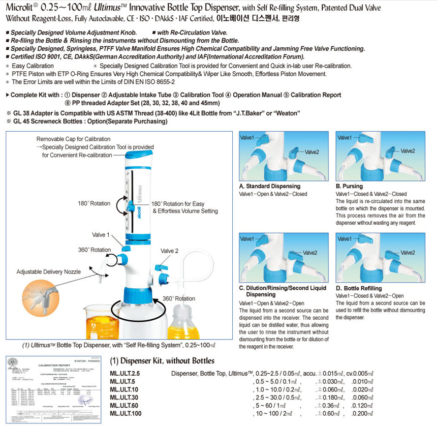 Microlit® 0.25~100㎖ UltimusTM Innovative Bottle Top Dispenser, with Self Re-filling System, Patented Dual ValveWithout Reagent-Loss, Fully Autoclavable, CE·ISO·DAkkS·IAF Certified, 이노베이션 디스펜서, 편리형