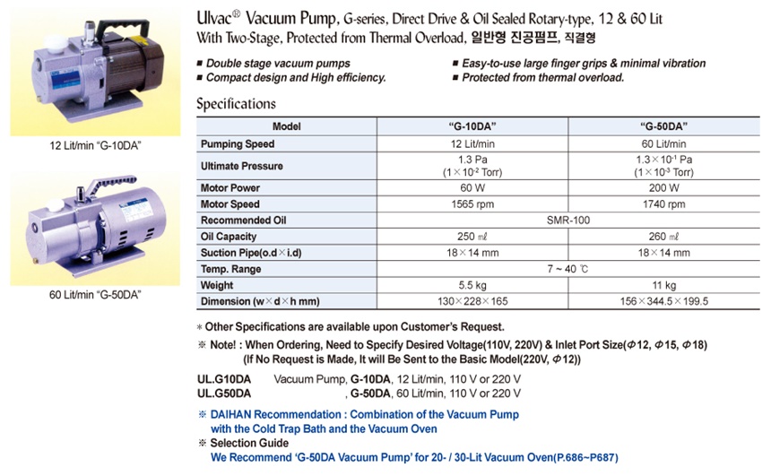 Ulvac® Vacuum Pump, G-series, Direct Drive & Oil Sealed Rotary-type, 12 & 60 LitWith Two-Stage, Protected from Thermal Overload, 일반형 진공펌프, 직결형