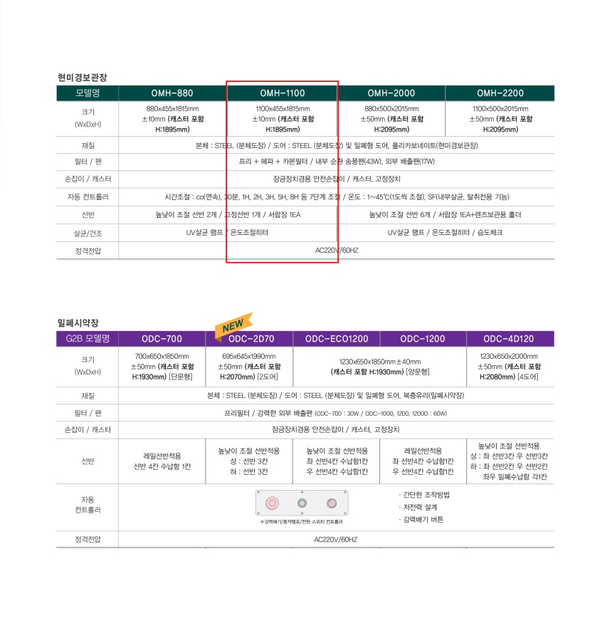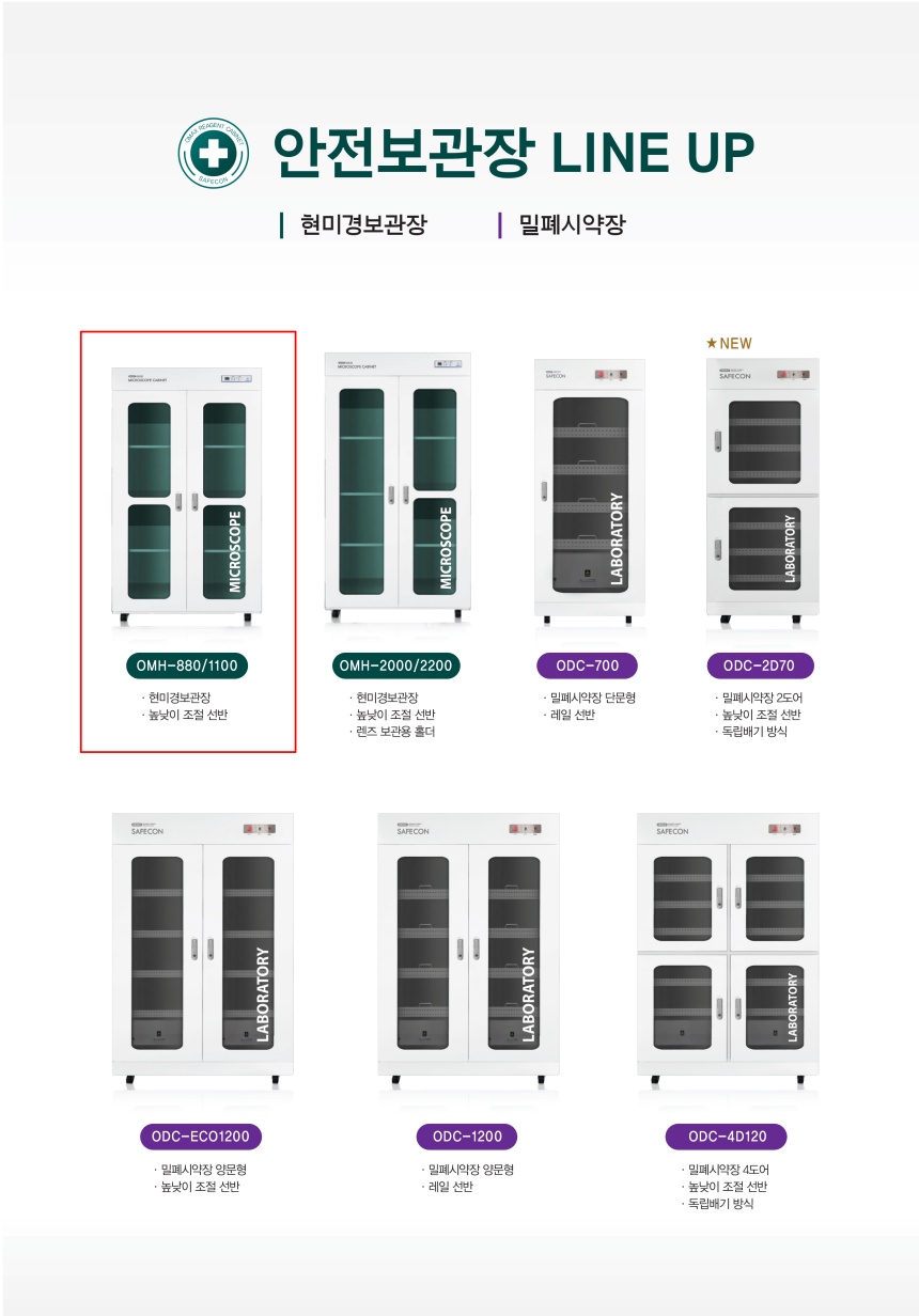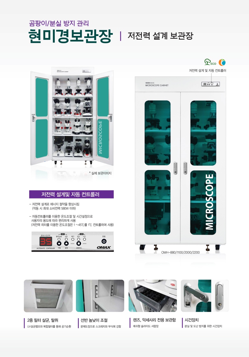품명 OMH-1100 현미경 보관장 / 과학실험실 안전 보관장 (높낮이 조절 선반 2개 / 고정선반 1개 / 서랍장 1EA UV살균 램프)