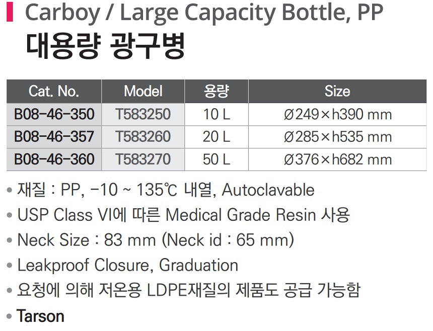 품명 ■ 재질 : PP, -10 ~ 135℃ 내열, Autoclavable ■ USP Class VI에 따른 Medical Grade Resin 사용 ■ Neck Size : 83 mm (Neck id 65 mm) ■ Leakproof Closure, Graduation ■ 요청에 의해 저온용 LDPE재질의 제품도 공급가능함 ■ Tarsons