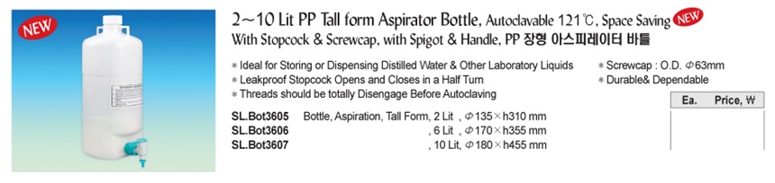 2~10 Lit PP Tall form Aspirator Bottle, Autoclavable 121 ℃ , Space SavingWith Stopcock & Screwcap, with Spigot & Handle, PP 장형 아스피레이터 바틀