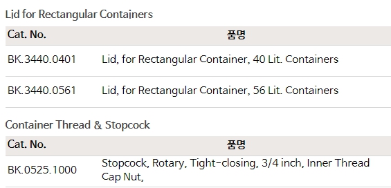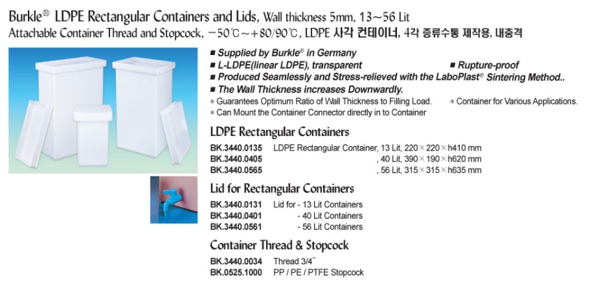 Burkle® LDPE Rectangular Containers and Lids, Wall thickness 5mm, 13~56 Lit Attachable Container Thread and Stopcock, -50℃~+80/90℃, LDPE 사각 컨테이너, 4각 증류수통 제작용, 내충격